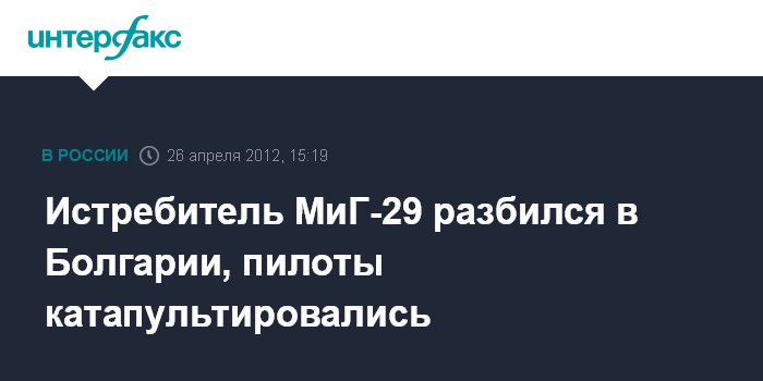 София. 26 апреля. INTERFAX.RU - Оба пилота болгарского истребителя МиГ-29 успели катапультироваться, прежде чем их самолет рухнул на землю во время учебного полета, заявили в министерстве обороны страны.