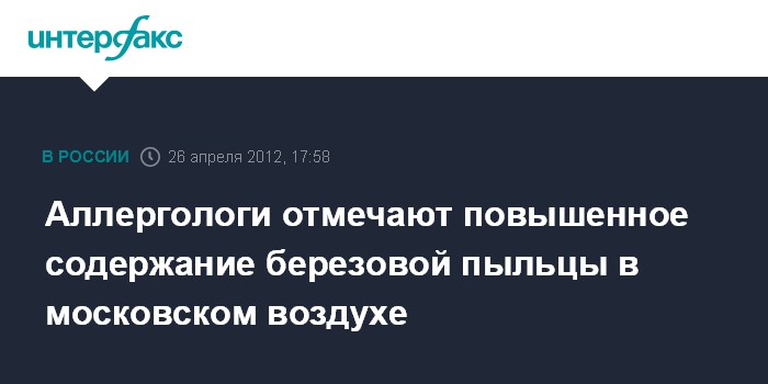 Москва. 26 апреля. INTERFAX.RU - Концентрация пыльцы березы в Москве сейчас превышает средний показатель практически в 4 раза, сообщил аллерголог, бренд-менеджер одной из фармацевтических компаний Анатолий Пономарев.