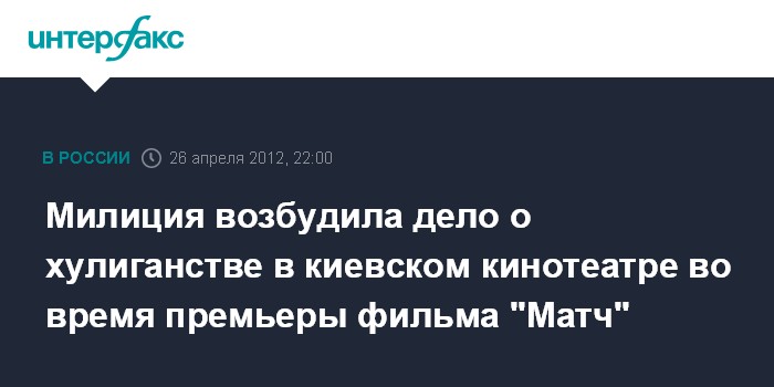 Киев. 26 апреля. INTERFAX.RU - Следственный отдел Печерского РУ ГУ МВД Украины в Киеве возбудил уголовное дело по факту хулиганства во время презентационного показа фильма "Матч" в столичном кинотеатре "Украина".