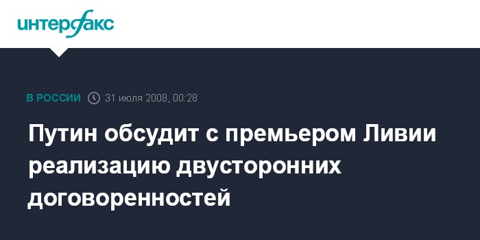 Москва. 31 июля. ИНТЕРФАКС - Председатель правительства России Владимир Путин проведет в четверг в Москве переговоры с Секретарем Высшего народного комитета (премьер-министром) Ливии аль-Багдади Али аль-Махмуди.