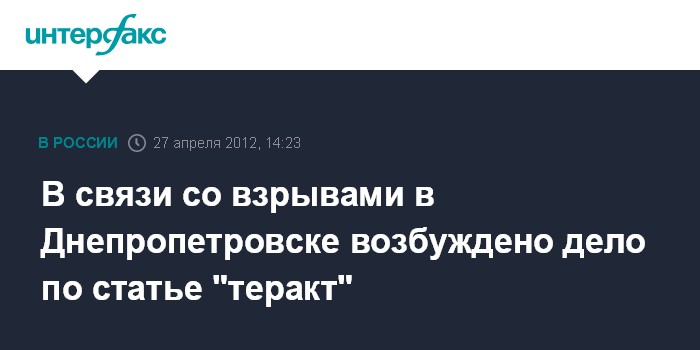 Киев. 27 апреля. INTERFAX.RU - Прокурор Днепропетровской области возбудил уголовное дело в связи со взрывами в городе по ч .2 ст. 258 УК Украины (террористический акт), сообщил агентству "Интерфакс-Украина" руководитель пресс-службы Генпрокуратуры Юрий Бойченко.