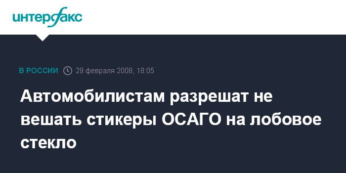 Москва. 29 февраля. INTERFAX.RU - Правительство РФ готовится подписать постановление, согласно которому автомобилисты получат право не вешать стикеры ОСАГО на лобовое стекло, сообщил агентству "Интерфакс-АФИ" источник в правительстве.