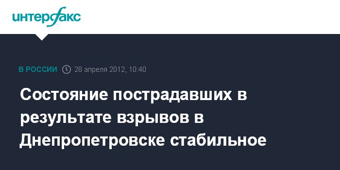 Днепропетровск. 28 апреля. INTERFAX.RU - Состояние 26 пострадавших в результате взрывов в Днепропетровске в пятницу - стабильное.