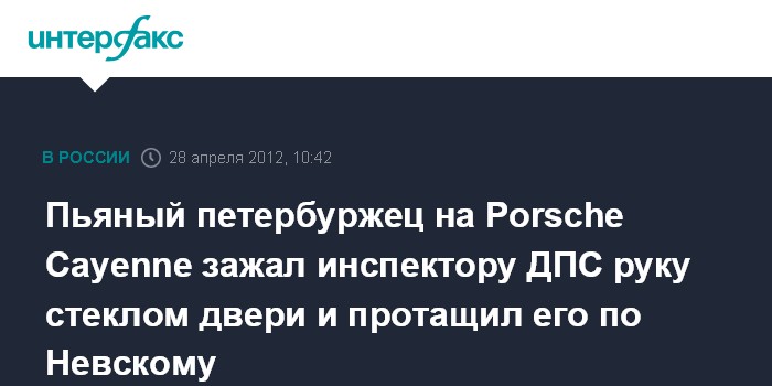 Санкт-Петербург. 28 апреля. INTERFAX.RU - В Петербурге 26-летний нетрезвый водитель автомобиля Porsche Сayenne протащил по асфальту Невского проспекта сотрудника ДПС во время проверки документов.