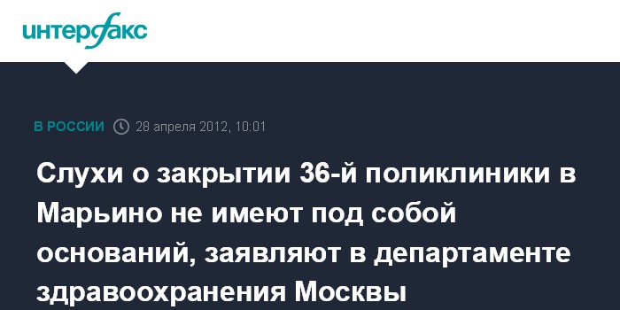 Москва. 28 апреля. INTERFAX.RU - В департаменте здравоохранения Москвы категорически опровергли появившиеся сообщения о том, что в столичном микрорайоне Марьино якобы закрывается поликлиника N36. "Это слух, который не имеет под собой никаких оснований", - заявил "Интерфаксу" в субботу руководитель столичного департамента здравоохранения Леонид Печатников. "В настоящее время департамент ищет источник этих слухов", - сказал он.