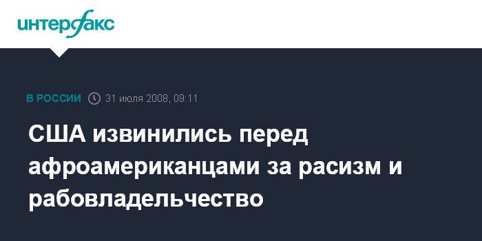 Москва. 31 июля. INTERFAX.RU - Палата представителей конгресса США одобрила резолюцию, в которой содержатся слова сожаления в адрес афроамериканцев в связи с проводившейся в США ранее политикой расовой сегрегации и рабовладения.