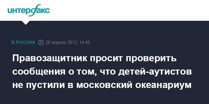 Москва. 28 апреля. INTERFAX.RU - Правозащитники просят проверить информацию о том, что в московский океанариум на Дмитровском шоссе не пустили группу детей, страдающих аутизмом.
