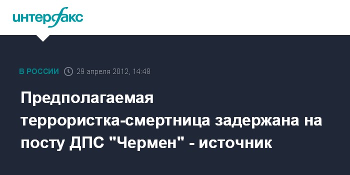 Москва. 29 апреля. INTERFAX.RU - На посту ДПС "Чермен" в воскресенье днем сотрудники правоохранительных органов задержали женщину, которая по базам проходит как террористка-смертница, сообщил "Интерфаксу" источник в правоохранительных органах.