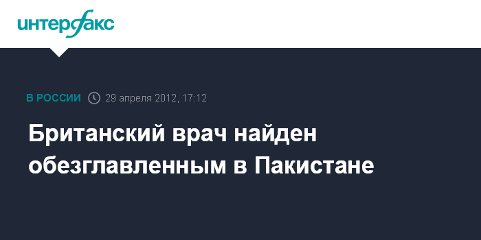 Исламабад. 29 апреля. INTERFAX.RU - Обезглавленное тело похищенного британского врача, работавшего в Международном комитете красного креста (МККК), обнаружено в городе Кетта в пакистанской провинции Белуджистан, сообщили в воскресенье местные власти. Тело 60-летнего Халила Расджида Дейла было найдено в пластиковом мешке, брошенном у дороги. На мешке черным маркером было написано имя жертвы.