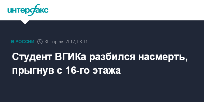 Москва. 30 апреля. ИНТЕРФАКС - Студент ВГИКа покончил с собой, прыгнув из окна общежития, сообщил "Интерфаксу" источник в правоохранительных органах.