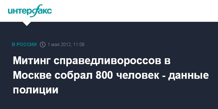 Москва. 1 мая. INTERFAX.RU - Около 800 человек собралось в Сокольниках на митинге "Справедливой России", сообщили "Интерфаксу" в пресс-службе ГУ МВД России по Москве. "По состоянию на 11 часов в Москве на митинге, организованном региональным отделением партии "Справедливая Россия", собралось около 800 человек при заявленных трех тысячах", - сказал представитель пресс-службы. Мероприятие проходит в сквере между станцией метро "Сокольники" и одноименным парком.