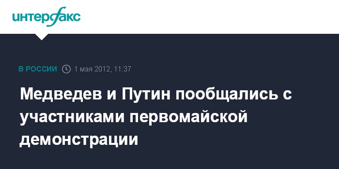 Москва. 1 мая. INTERFAX.RU - Президенту РФ Дмитрию Медведеву и избранному президенту, премьеру Владимиру Путину понравилась идея возродить первомайские демонстрации. С таким предложением к Д.Медведеву и В.Путину обратилась одна из участниц первомайского шествия, организованного российскими профсоюзами. Руководители государства вместе с другими демонстрантами прошли по центру столицы. "Давайте сделаем это каждый год, сделаем традицией. Нам нравится", - обратилась к Д.Медведеву участница манифестации. "И нам нравится", - ответил Д.Медведев.
