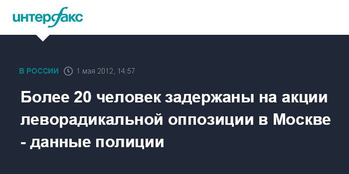 Москва. 1 мая. INTERFAX.RU - Полиция задержала 22 человек на Трубной пощади столицы, где проходит так называемый "Левый марш", сообщили "Интерфаксу" в пресс-службе ГУ МВД России по Москве. "Перед началом шествия, организованного группой граждан, которое проходит с 14 до 15.30 часов от Трубной площади, в котором принимает участие около 500 человек, за нарушение правил проведения массовых мероприятий задержаны 22 человека, причисляющих себя к анархистам. Все они отказались снимать маски при проверке документов и планировали осуществить провокации на мероприятии", - сказал представитель пресс-службы.
