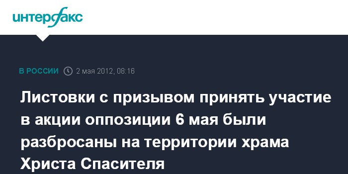 Москва. 2 мая. INTERFAX.RU - Неизвестные во вторник на территории храма Христа Спасителя разбросали листовки с призывом принять участие в протестной акции 6 мая, сообщил "Интерфаксу" источник в правоохранительных органах столицы.