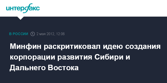 Москва. 2 мая. ИНТЕРФАКС-АФИ - Минфин РФ подверг жесткой критике идею создания отдельной госкорпорации для реализации проектов развития Сибири и Дальнего Востока, представив свои возражения сразу по нескольким ключевым пунктам этой концепции.