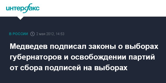 Горки. 2 мая. INTERFAX.RU - Президент РФ Дмитрий Медведев сообщил, что подписал законы о новом порядке выборов губернаторов РФ, а также об освобождении политических партий от необходимости собирать подписи.