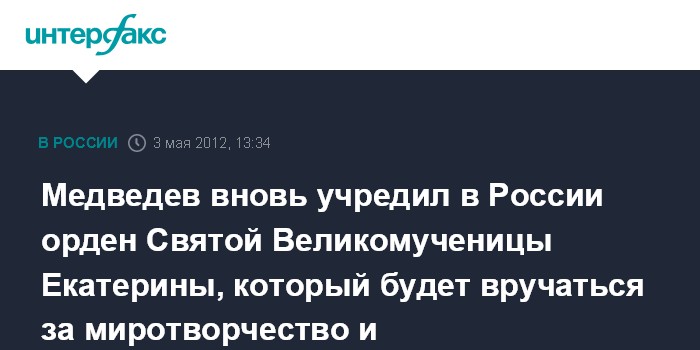 Москва. 3 мая. INTERFAX.RU - Президент РФ Дмитрий Медведев сообщил, что подписан указ о введении новых госнаград - Ордена Святой Великомученицы Екатерины и специального знака отличия "За благодеяния". "Я подписал указ о введении нового Ордена Святой Великомученицы Екатерины и специального знака отличия "За благодеяния", - сообщил Медведев на вручении госнаград в Кремле.