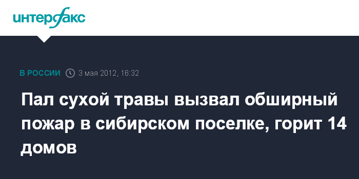 Москва. 3 мая. INTERFAX.RU - Огонь, распространившийся при пале сухой травы, перекинулся на поселок Разгуляевка в Красноярском крае, сообщили "Интерфаксу" в управлении информации МЧС РФ.