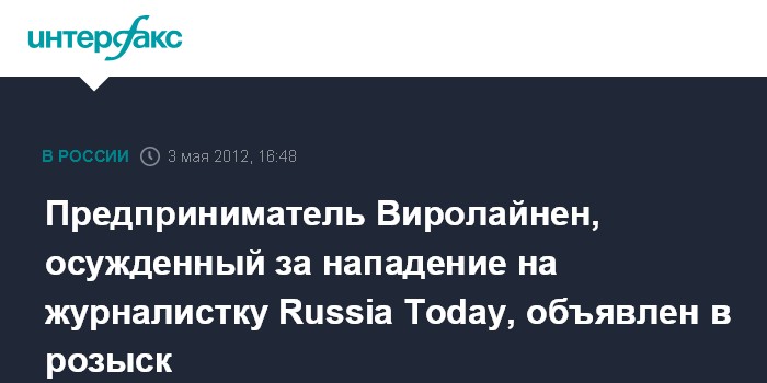 Санкт-Петербург. 3 мая. INTERFAX.RU - Петербургский предприниматель Сергей Виролайнен, осужденный за нападение на редактора канала Russia Today Наталью Архипцеву, проигнорировал судебное решение и не явился к представителям Федеральной службы исполнения наказаний. "Виролайнен не явился в срок, а также не вышел на связь с представителями ведомства, в связи с чем был объявлен в розыск", - сообщили "Интерфаксу" в четверг в пресс-службе управления ФСИН по Петербургу и Ленинградской области.