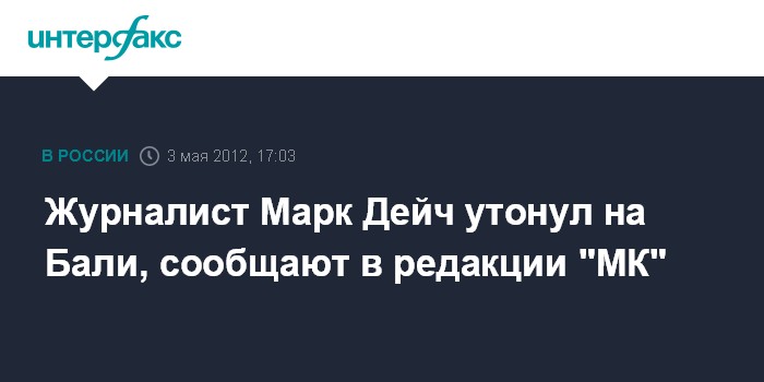 Москва. 3 мая. INTERFAX.RU - Известный журналист Марк Дейч погиб, находясь на отдыхе на острове Бали в Индонезии. "Сегодня нам сообщили эту трагическую новость. Марк погиб, утонув в океане. Он много лет сотрудничал с нашим изданием", - сообщили в четверг "Интерфаксу" в редакции "МК".