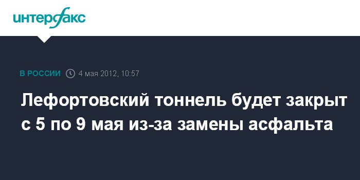 Москва.4 мая. INTERFAX.RU - Лефортовский тоннель на востоке Москвы будет закрыт для транспорта с вечера субботы до утра среды из-за ремонта асфальта, сообщила пресс-секретарь предприятия "Кольцевые магистрали" Ольга Панова.