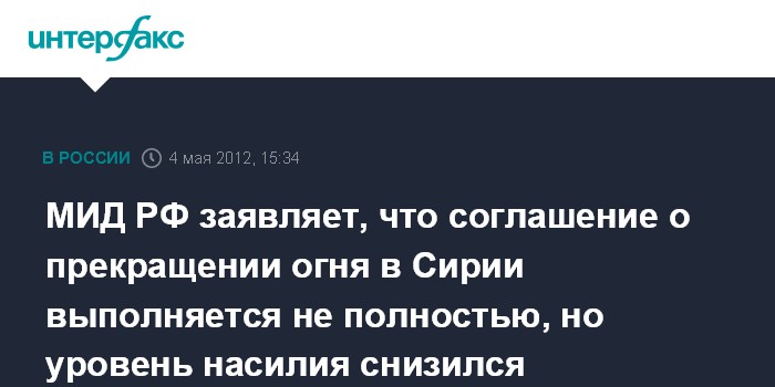 Москва. 4 мая. INTERFAX.RU - Соглашение о перемирии в Сирии нарушается с обеих сторон, но в целом обстановка в стране улучшилась, считает официальный представитель МИД РФ Александр Лукашевич.