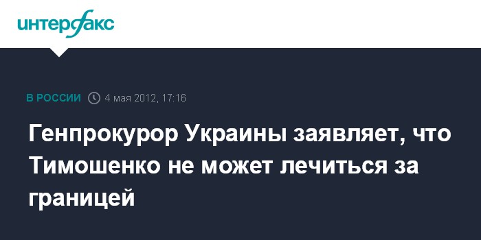 Киев. 4 мая. INTERFAX.RU - Лечение экс-премьера Украины Юлии Тимошенко за рубежом не позволяет украинское законодательство, подчеркивает генеральный прокурор Украины Виктор Пшонка.