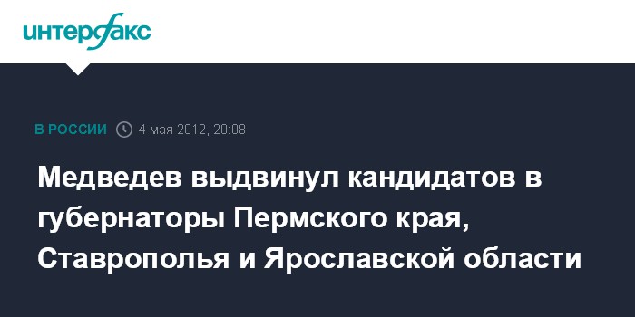 Медведев выдвинул кандидатов в губернаторы Пермского края, Ставрополья и Ярославской области