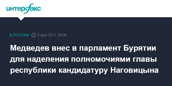 Москва. 5 мая. INTERFAX.RU - Президент России Дмитрий Медведев внес на рассмотрение Народного Хурала Республики Бурятия кандидатуру Вячеслава Наговицына для наделения его полномочиями главы Республики Бурятия, сообщили в субботу в пресс-службе Кремля.