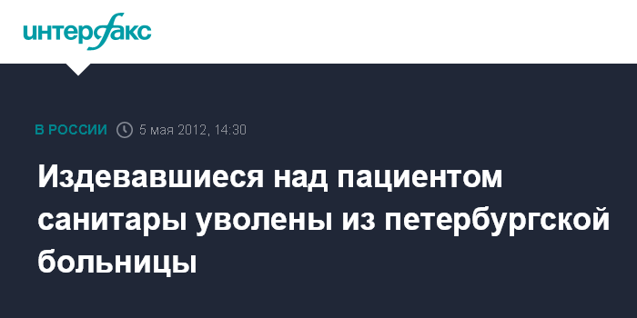 Санкт-Петербург. 5 мая. INTERFAX.RU - Двое санитаров, уличенных следователями в издевательстве над пациентом, уволены из петербургской Елизаветинской больницы по соглашению сторон, сообщили "Интерфаксу" в субботу в медицинском учреждении.