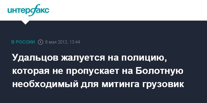 Москва. 6 мая. INTERFAX.RU - Столичная полиция не пропускает на Болотную площадь грузовик, из которого планировалось монтировать сцену для митинга "марша миллионов", сообщил один из организаторов акции Сергей Удальцов. "Полчаса назад, в соответствии с графиком, автомобиль прибыл к Болотной площади со стороны кинотеатра "Ударник". До сих пор полиция отказывается его пропустить на площадь", - сказал С.Удальцов "Интерфаксу" в воскресенье.