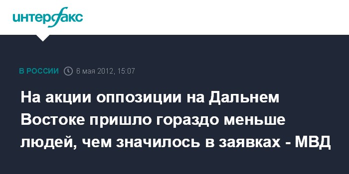 Москва. 6 мая. INTERFAX.RU - Акции оппозиции на Дальнем Востоке были немногочисленными, за различные нарушения к административной ответственности привлечено семь человек, сообщили в воскресенье "Интерфаксу" в пресс-центре МВД РФ.
