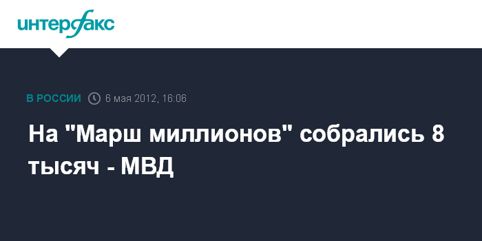 Москва. 6 мая. INTERFAX.RU - К 16:00 воскресенья на Калужской площади столицы собрались менее 10 тысяч участников "Марша миллионов", сообщили "Интерфаксу" в пресс-службе ГУ МВД России по Москве. "К установленному времени начала так называемого "Марша миллионов" на Калужской площади собралось около восьми тысяч человек", - сказал представитель пресс-службы.