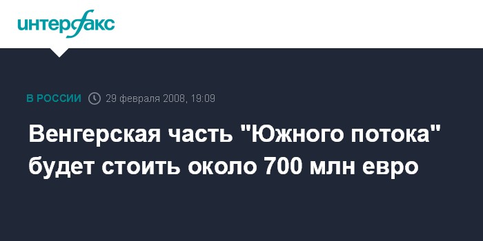 Будапешт. 29 февраля. INTERFAX.RU - Ожидается, что строительство венгерской части газопровода "Южный поток" обойдется примерно в 700 млн евро, заявил министр финансов Венгрии Янош Вереш.