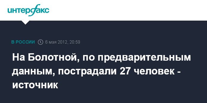Москва. 6 мая. INTERFAX.RU - Во время митинга оппозиции на Болотной площади в Москве пострадало, по предварительным данным, 27 человек, сообщил "Интерфаксу" источник в медицинских кругах. Среди пострадавших - как участники шествия, так и полицейские.