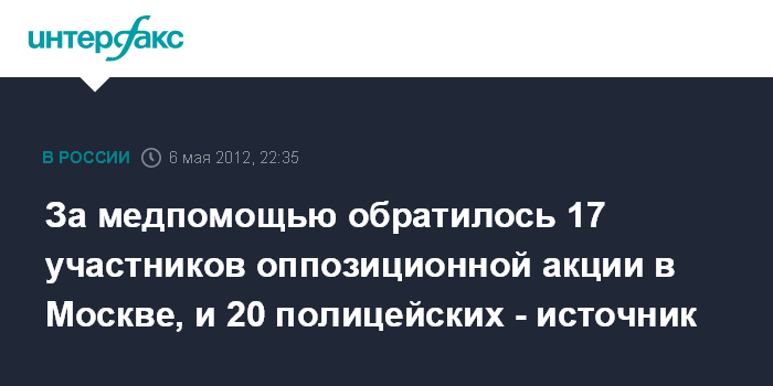 Москва. 6 мая. ИНТЕРФАКС - 17 участников оппозиционной акции на Болотной площади в Москве обратилось за медицинской помощью, кроме того, пострадало 20 полицейских, сообщил "Интерфаксу" источник в медицинских кругах.