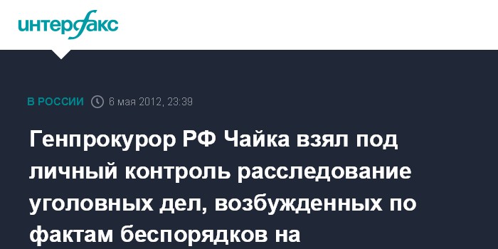 "Генеральный прокурор Юрий Чайка взял под личный контроль расследование уголовных дел, возбужденных в связи с беспорядками в центре Москвы в районе Болотной площади", - сказала М.Гриднева.
