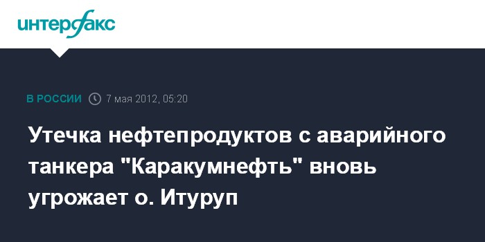 Южно-Сахалинск. 7 мая. ИНТЕРФАКС–ДАЛЬНИЙ ВОСТОК – Угроза утечки топлива сохраняется на аварийном танкере «Каракумнефть», севшем на мель в районе портпункта Курильска (о. Итуруп, Средние Курилы – ИФ) 15 февраля, сообщает пресс-служба Сахалино-Курильского терруправления (СКТУ) Росрыболовства в понедельник.