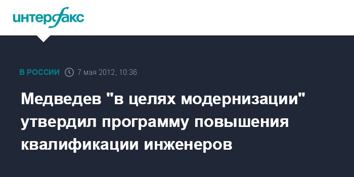 Москва. 7 мая. INTERFAX.RU - Президент России Дмитрий Медведев, покидающий в понедельник свой пост, подписал указ "О президентской программе повышения квалификации инженерных кадров на 2012 - 2014 годы", сообщает пресс-служба Кремля. "В целях модернизации и технологического развития экономики России постановляю: Утвердить президентскую программу повышения квалификации инженерных кадров на 2012 - 2014 годы", - говорится в документе.