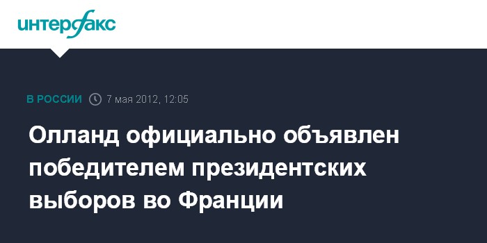 Париж. 7 мая. INTERFAX.RU - Кандидат в президенты Франции социалист Франсуа Олланд победил на президентских выборах, заручившись поддержкой 51,62% голосов избирателей - таковы окончательные данные голосования, оглашенные в понедельник МВД Франции. Второе место в гонке с 48,38% голосов занял нынешний президент страны Николя Саркози.