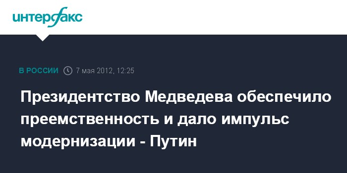 Москва. 7 мая. INTERFAX.RU - Президент РФ Владимир Путин заявил, что период президентства Дмитрия Медведева обеспечил преемственность развития России и пожелал бывшему главе государства успехов.
