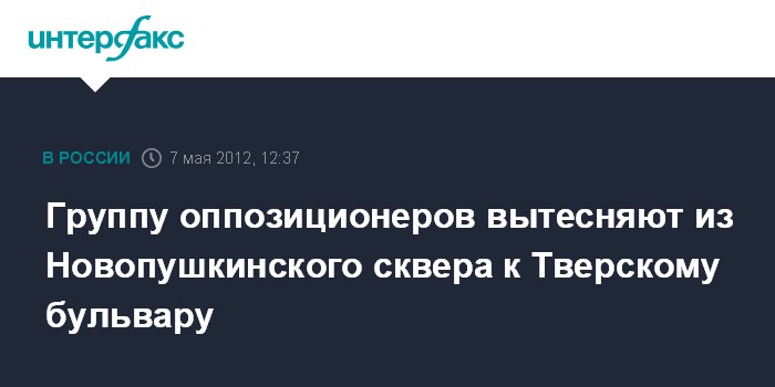 Москва. 7 мая. INTERFAX.RU - Группа оппозиционеров собралась в Новопушкинском сквере в центре Москвы, передал корреспондент "Интерфакса". По данным корреспондента, часть людей пришла в сквер с Тверской улицы, часть - со стороны Тверского бульвара. К одежде и сумкам оппозиционеров прикреплены белые ленты, некоторые держат в руках белые воздушные шары. На место прибыли сотрудники полиции, которые взяли ситуацию под контроль. Собравшихся оттесняют в сторону Тверского бульвара.