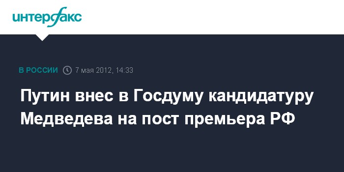 Москва. 7 мая. INTERFAX.RU - Президент России Владимир Путин внес в Госдуму кандидатуру Дмитрия Медведева для получения согласия депутатов на назначение его председателем правительства РФ, сообщил в понедельник журналистам спикер палаты Сергей Нарышкин.