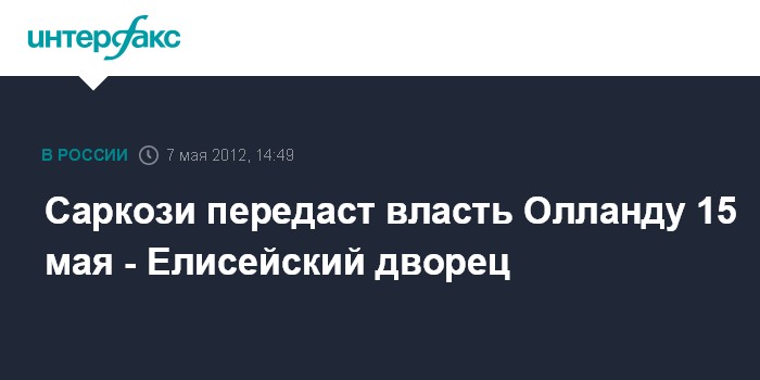 Париж. 7 мая. INTERFAX.RU - Церемония передачи властных полномочий от уходящего президента Франции Николя Саркози избранному президенту Франсуа Олланду состоится 15 мая, сообщила в понедельник канцелярия Елисейского дворца. В канцелярии президента Франции также отметили, что в памятных мероприятиях 8 мая, приуроченных ко Дню победы во Второй мировой войне в Париже, будут принимать участие оба президента - и уходящий, и избранный.
