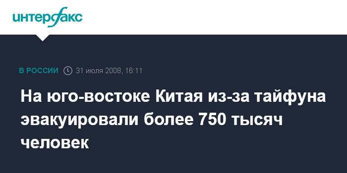 Москва. 31 июля. INTERFAX.RU - Из городов и уездов южных и юго-восточных провинций Китая Гуандун, Фуцзянь и Чжэцзян, которым угрожал тайфун "Фэнвэн", эвакуированы в общей сложности 751,6 тыс. человек, цитируют китайские СМИ сообщение государственного штаба по борьбе с наводнениями и засухами.