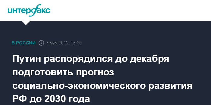 Москва. 7 мая. INTERFAX.RU - Основные направления деятельности правительства РФ до 2018 года и прогноз долгосрочного социально-экономического развития России на период до 2030 года должны быть утверждены до 1 декабря 2012 года. Соответствующее поручение правительству содержится в указе президента РФ Владимира Путин "О долгосрочной государственной экономической политике". В.Путин подписал этот указ менее чем через три часа после вступления в должность президента.