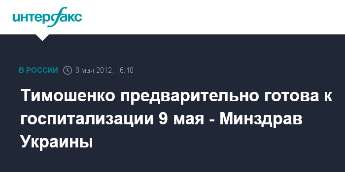 Киев. 8 мая. INTERFAX.RU - В министерстве здравоохранения Украины подчеркивают, что экс-премьер Украины Юлия Тимошенко сообщила медкомиссии о предварительной готовности лечь в ЦКБ № 5 "Укрзализныци" в Харькове 9 мая.
