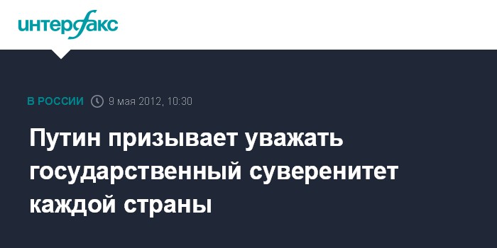 "Сегодня хочу подчеркнуть: строгое соблюдение международных норм, уважение государственного суверенитета и самостоятельного выбора каждого народа - это одна из безусловных гарантий того, что трагедия прошедшей войны никогда не повторится", - сказал В.Путин в среду на Красной площади, где проходит парад в честь 67-й годовщины Победы в Великой Отечественной войне.