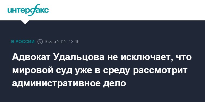 Москва. 9 мая. INTERFAX.RU - Оппозиционера Сергея Удальцова везут в суд, где будет рассмотрено административное дело о неповиновении требованиям сотрудников полиции, сообщила в среду "Интерфаксу" адвокат Виолетта Волкова. "У меня появилась информация о том, что моего подзащитного С.Удальцова в данный момент везут в 418-й участок мирового суда для рассмотрения его дела", - сказала В.Волкова.