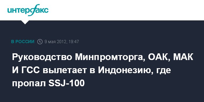 Москва. 9 мая. INTERFAX.RU - Руководство Минпромторга, Объединенной авиастроительной компании, Авиационного регистра Межгосударственного авиационного комитета, компании "Гражданские самолеты Сухого (ГСС)" вылетают в среду в Индонезию, где пропал самолет "Суперджет-100", сообщил президент ГСС Владмимир Присяжнюк.